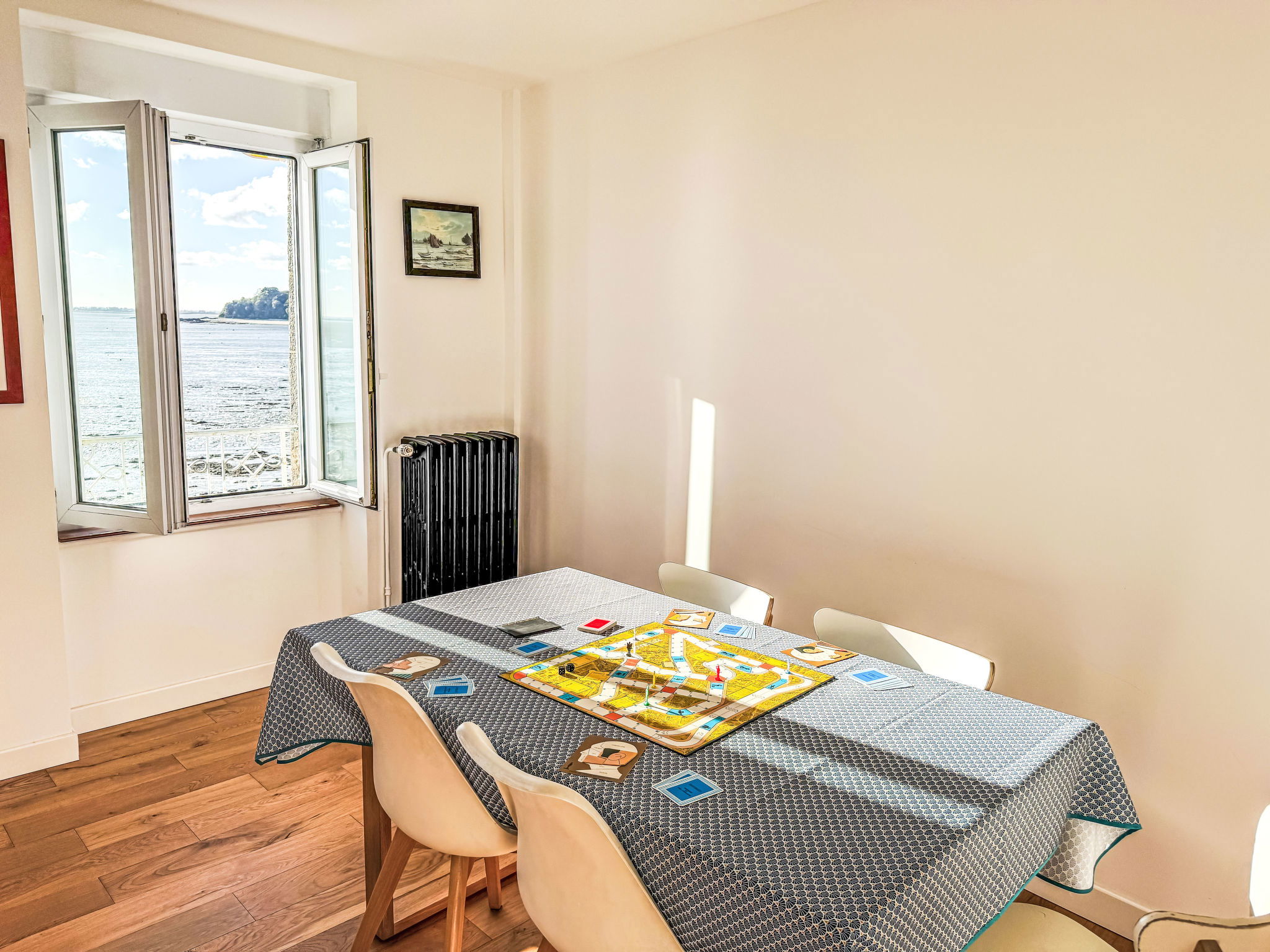 "L'Emeraude", 2-room apartment 55 m2 on 1st floor. Beautiful and modern furnishings: large living/dining room 30 m2 with 1 sofabed (140 cm, length 190 cm). 1 room with 1 french bed (1 x 140 cm, length 190 cm). Open kitchen (oven, dishwasher, 4 induction hot plates, toaster, kettle, microwave, electric coffee machine). Bathroom, sep. WC. Gas heating. Parquet floors. Terrace 12 m2. Terrace furniture. Very beautiful view of the sea and the port. Facilities: washing machine. Internet (WiFi, extra). Garage (1 car). Please note: non-smokers only. Smoke alarm. Offer by a private individual according to Art. 155, IV of CGI.